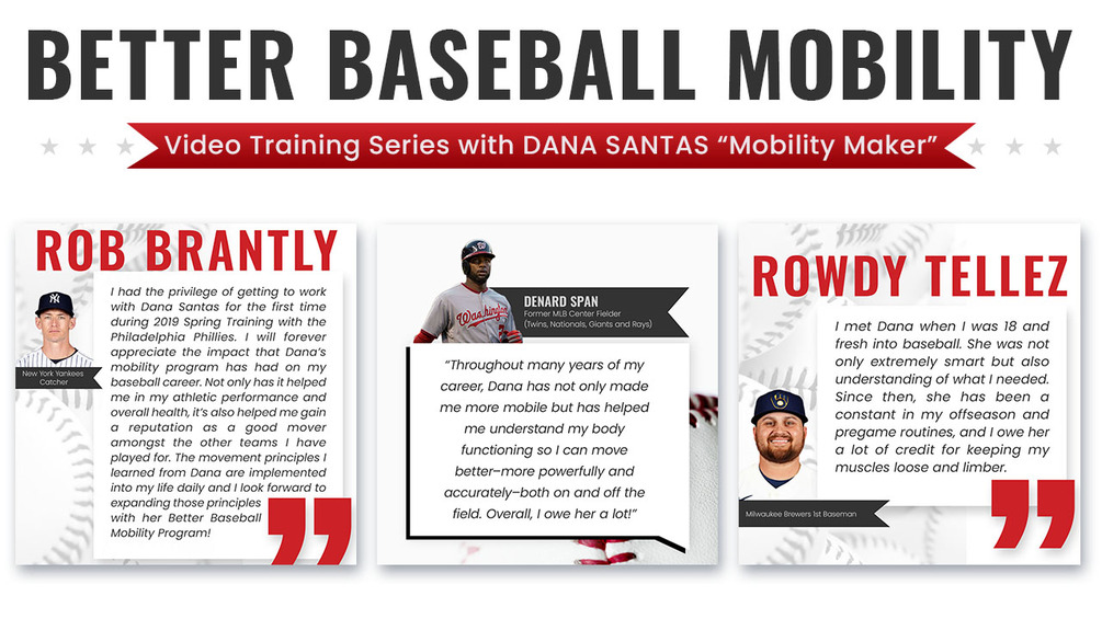 Better Baseball Mobility is a mobility training video series originally created exclusively for Major-League Baseball during the 2020 pandemic lockdown. Using her two decades of experience working in MLB as a Breathing, Mobility and Mind-Body Coach to more than a dozen pro baseball teams and thousands of players, Dana Santas, known as the "Mobility Maker," designed the program with input from seasoned MLB pitching, hitting, catching and strength & conditioning coaches to provide exercises and detailed instruction for pro baseball players to enhance and maintain the mobility, stability and balance needed to perform at the highest levels in their respective positions.